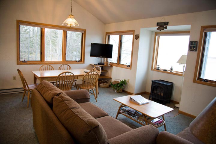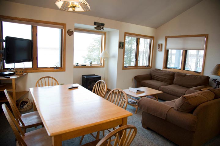 Teal Wing sleeps up to 8 people and has its own private 1 acre lot with 100 feet of lake frontage. There is a dock and boat lift available for summer use as well (2500 lb. boat weight restriction applies). Next to the dock is a shallow swimming area suitable for small children as there is no steep drop off or rocky shoreline. There is also a fire ring/pit area outside (firewood not provided). Snowmobilers have direct access to Trail #1. Mallard Cove and Teal Wing are conveniently located on adjoining lots to accommodate larger groups, yet still provide privacy for separate parties.